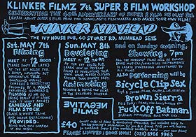 Global Super 8 Day - Calendar of Events SATURDAY May 7th, noon Klinker Filmz 8th Super 8 Film workshop to celebrate 40 years of Super 8 on the 7th and 8th of May. Participants will learn how to operate the cameras and film on Saturday, then hand process negative black and white and colour films in Lomo tanks on Sunday. There will also be a workshop in drawing and painting on film (direct animation) as well as musical performances by Super 8 artists in the evening. For more info email james at james.holcombe@learningtrust.co.uk or call 0208 966 9963 |