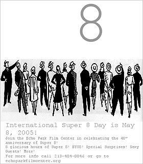 Global Super 8 Day - Feedbacks Thanks for posting all the info about International Super 8 Day... it's great to see what everyone was up to all around the world... At the Echo Park Film Center in Los Angeles, we celebrated International Super 8 Day with 8 Glorious Hours of Super 8!!!!! A fine time was had by all! This was the program... Can't wait till next year!!! xxx Lisa, L.A. (06.15.2005) PROGRAMM SUNDAY May 8th, 2pm 22 PM - 4 PM: EPFC Presents Fun For the Whole Family with Old School Animation, Comedy Shorts, 60's Advertisements, Hollywood History, Herbie the Love Bug and MORE! 4 PM - 5 PM: Norwood Cheek Presents Best of Attack of the 50 Ft. Reels 5 PM - 6 PM: Roger Beebe Presents Super 8 Faves Featuring Films by Chris Jolly 6 PM - 8PM: Neil Young's Greendale 8 PM - 10PM: BYO8 (Open Screen... Bring your own Super 8!) |